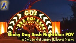 Full Nighttime Slinky Dog Dash Roller Coaster POV in Toy Story Land at Disney's Hollywood Studios